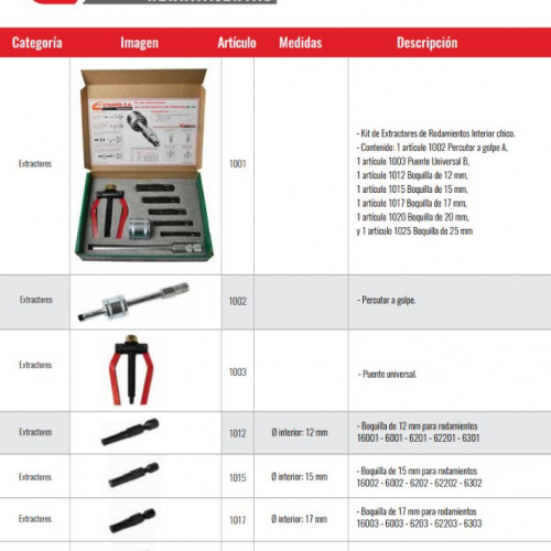 Extractores De Rodamientos internos (Interiores) Con Mango Inercial y Boquillas en KIT (Juego) y Sueltos Marca EXTRAPOL Modelos 1001-1002-1003-1012-1015-1017-1020-1025