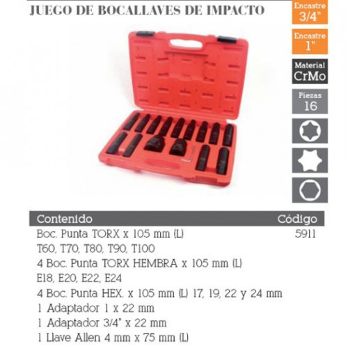 JUEGO DE PUNTAS Y TUBOS TORX MACHO/HEMBRA EXTRAGRANDE HASTA T100-E24 CON ENCASTRE DE ¾”+1” MARCA BREMEN 5911