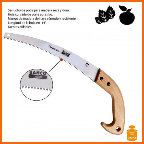 Serrucho de Poda Manual Semicurvo Con 11 Dientes Tratados y largo de 12” o 14” Mango Madera Marca BAHCO-SANDVIK TRADITION 4212-6T/ 4214-6T