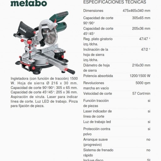 Sierra Ingleteadora Deslizante (Desplazable/Telescópica) Para Corte de Aluminio/Madera de Diámetro 216mm(8.1/4”) Marca METABO KGS216M