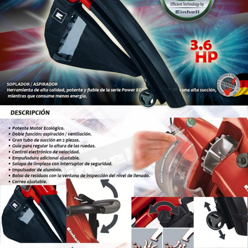 Soplaaspirador SOPLADOR+ASPIRADOR Eléctrico 300Km/h Con Barrehojas Marca EINHELL GE-EL 1800