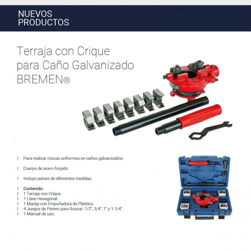 Terraja (Roscadora) Regulable Con Crique y Peines Para Caños de Hierro Gas Hasta 4” Marca BREMEN 7180-BREMEN 7181