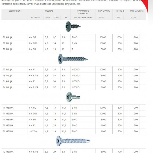 Tornillos Autoperforantes Punta Mecha/Punta Aguja Cabeza Philips Para Durlok-Zinguería Marca TEL-DRY T1-MECHA/T2-MECHA
