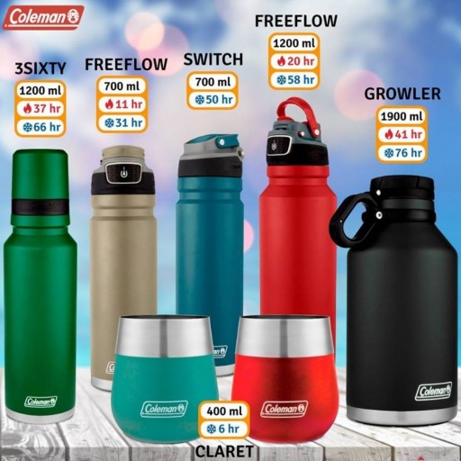 Termos-Botellas Térmicas Deportivas-Growler-Vasos Térmicos Claret Materos de Larga Duración y Picos Automáticos Marca COLEMAN FREEFLOW-SWITCH-3SIXTY
