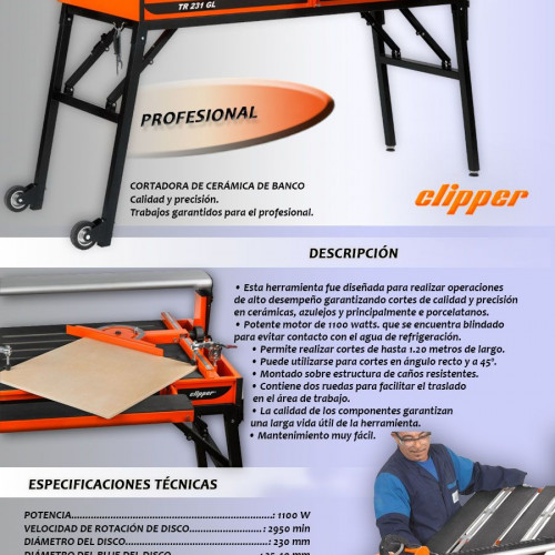 CORTADORA DE CERAMICOS Y PORCELANATOS ELECTRICA DE PIE MARCA CLIPPER TR231