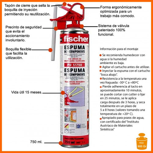 Espuma Poliuretánica de 1 Componente En Aerosol de 750cc Que Se Expande a 45 Litros Marca FISCHER PU 1/750