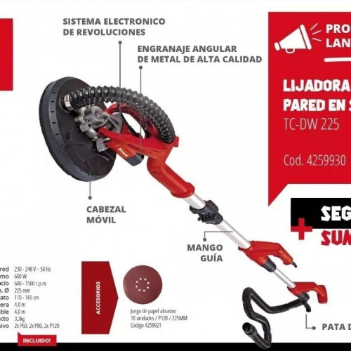 Lijadora Telescópica Cabezal Basculante Para Techos y Paredes de Yeso (DURLOK) Con Disco de 230mm y Aspiración Marca EINHELL TCDW225
