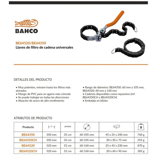 Llave Sacafiltros de Aceite a Cadena y Palanca Capacidad 60-120mm Marca BAHCO AUTOMOTIVE BE64350