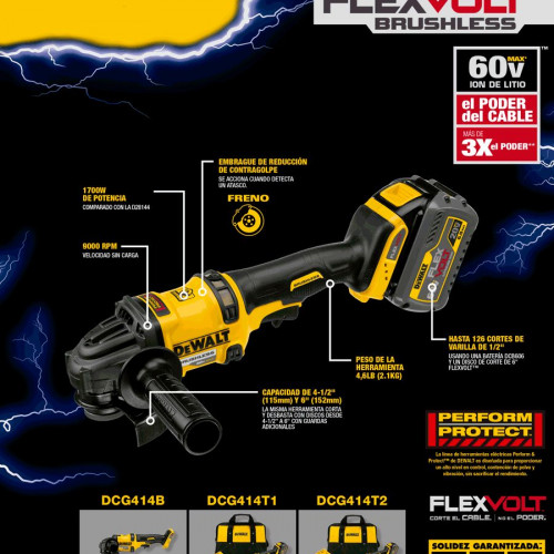 Amoladora Angular Tecnología FLEXVOLT LITHIUM 60v (1700w) Con Capacidad de 5” y de 6” (Doble Cubredisco) Con Motor BRUSHLESS Sin Carbones Marca DeWALT DCG414T2