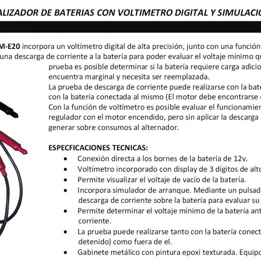 Analizador/Probador de Baterías Con Voltímetro Digital y Simulador de Arranque Marca PDM-E20-PITARCH