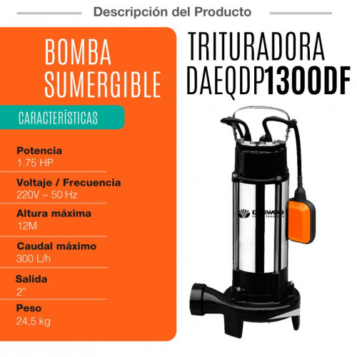 Bomba Sumergible Automática Cloaquera Trituradora Con Cuerpo INOX Marca DAEWOO DAEQDP1300DF