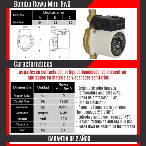 BOMBA PRESURIZADORA DE AGUA DOMICILIIARIA AUTOMÁTICA MARCA ROWA MINI RW9”