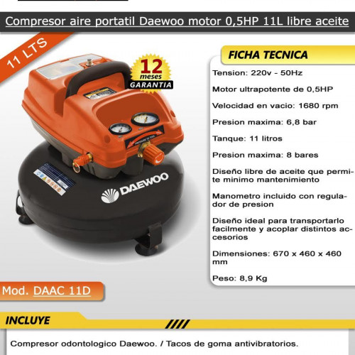 Compresor UFO de Carter Seco Tipo Odontológico Sin Aceite Marca DAEWOO DAAC11D