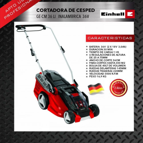Cortacésped Inalámbrica Recargable Con Tecnología LITIUM Para 2 Baterías de 18v (36V) y Cargador de 45min Marca EINHELL GE-CM 36 LI