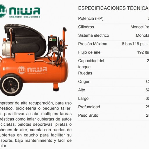 Compresor Axial Directo (Sin Correa) Monocilíndrico Con Motor 2HP y Tanque de 25 Litros Marca NIWA-LÜSQTOFF