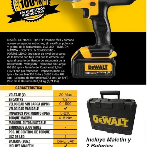 Llave de Impacto Inalámbrica a Batería Recargable Con Encastre de ½” Tecnología LITIUM 20V MAX Marca DeWALT DCF889M2