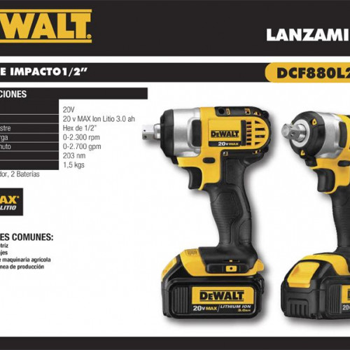Llave de Impacto Inalámbrica a Batería Recargable Con Tecnología LITIUM 20V Encastre de ½” Marca DeWALT DCF880L2 -AR